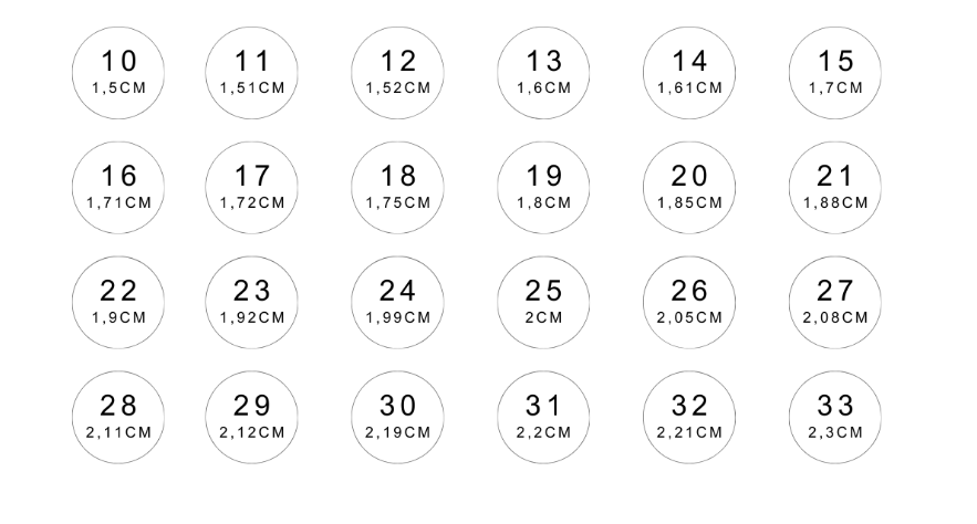 | Tamanho | Diâmetro (mm) | Circunferência (mm) |
